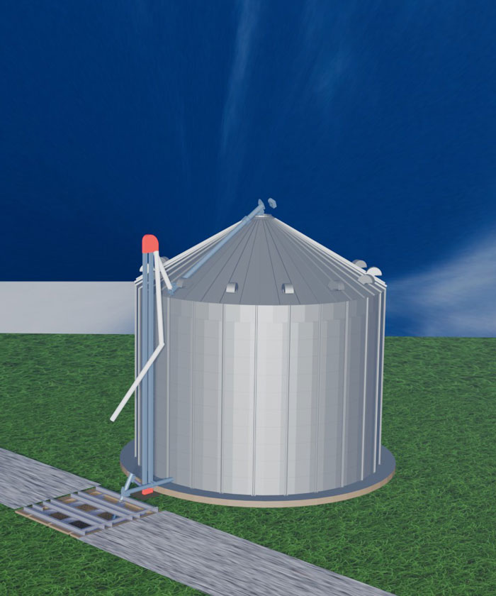 Single silo, with bucket elevator and and inclined roof auger and unload auger to dump pit.
