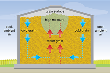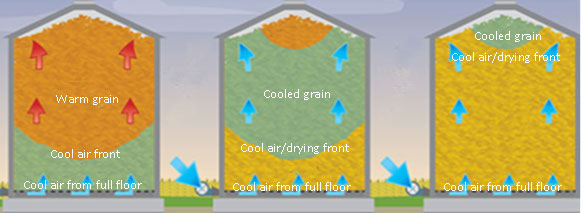 Aeration is a type of temperature control in the silo, to prevent moisture migration – most losses in silos are due to moisture migration. Grain is a good heat isolator, so it doesn’t cool off very quickly in the silo, especially in winter times, when temperatures outside rapidly drop. The air near the silo wall starts cooling off due to the colder outside temperatures, and the cold air starts to descend to the bottom of the silo (cold air descends – warm air rises – think of hot air balloons). As the cool air descends, it causes a convection stream of air through the silo – because as the cool air gets into contact with the warm grain in the centre of the silo, it heats up again, and starts rising.