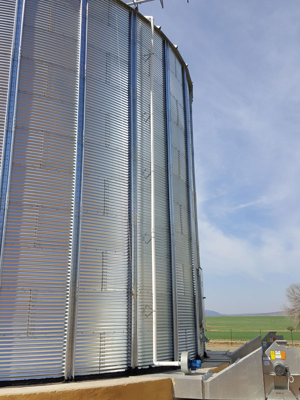 The principle of the fumigant recirculating system is that, because phostoxin is lighter than air, it will naturally rise through the grain – and settle in the roof of the silos (assuming the roof vents are closed). The fumigation fan, then sucks the poison laden air from the top of the roof, and pushes it into the bottom of the silo, through the aeration floor. Because the poison is ligher than air, the poison will once again rise through the grain, killing the insects in the silo, and once again settle in the roof where the fan will suck it back down again. This process is run continuously for around 3 days, to ensure that the poison has had time to kill the maximum amount of insects and their eggs, and to allow the poison to reach all the areas in the silo.
