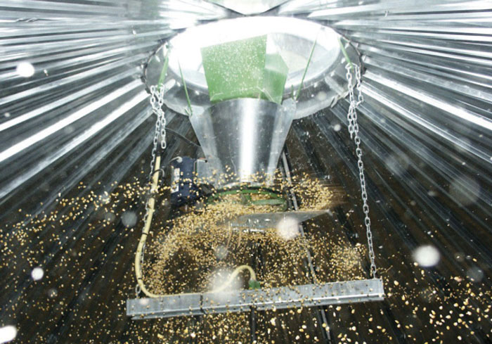 - By spreading the grain when loading – a level grain profile is created in the silo, instead of the normal conical heap created by the angle of repose of the grain. This allows for a more even aeration throughout all the grain