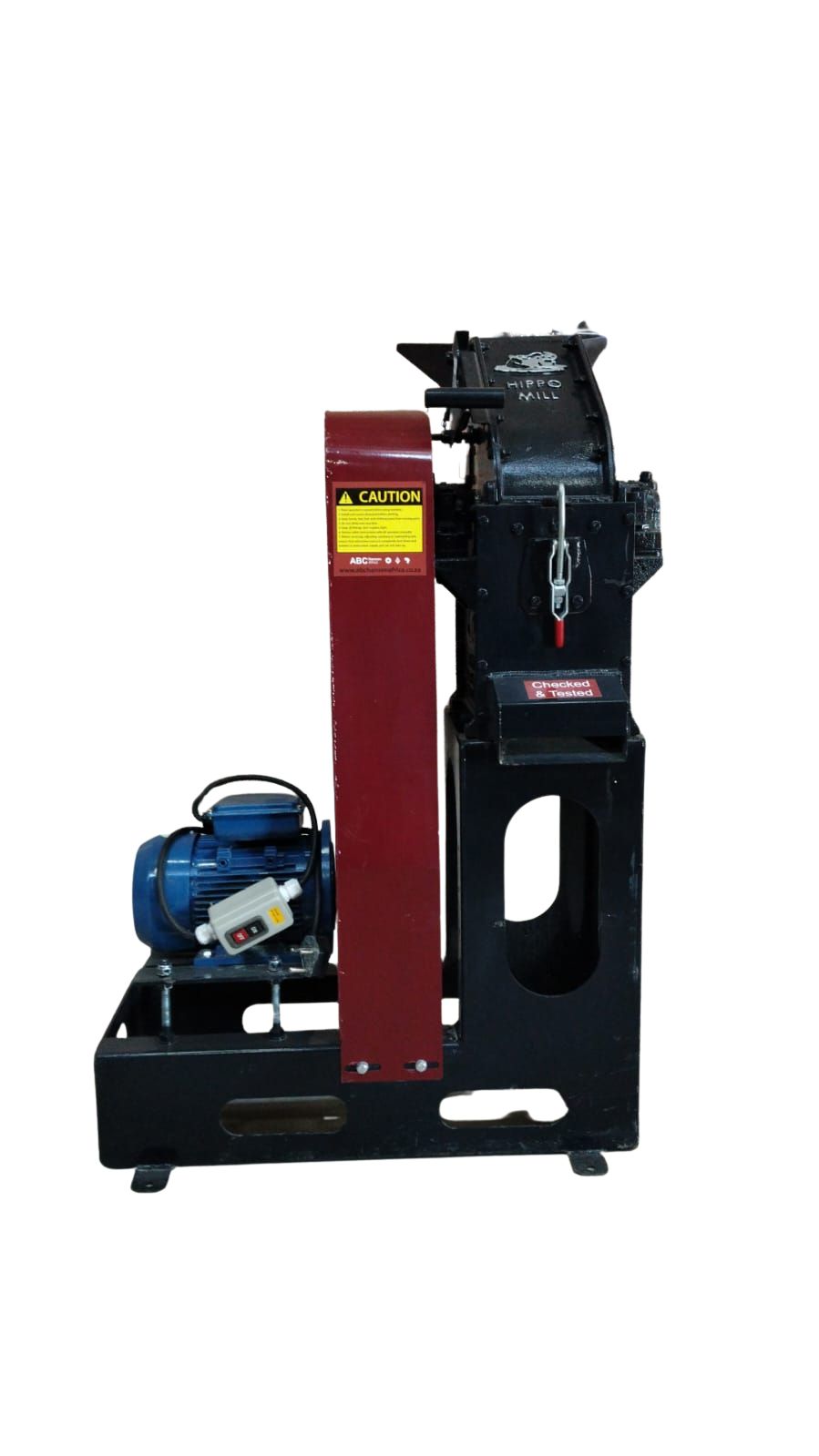 The design of the Baby HIPPO HAMMER MILL is unique in that there are no chopping knives, as the material is being fed directly onto the tips of the rotating hammers in the direction in which the hammers are rotating. The milled material is gravity fed out the front of the mill at a convenient bag off height of 850mm on the front drop models, and at a height of 850mm from the cyclone on the with fan models.