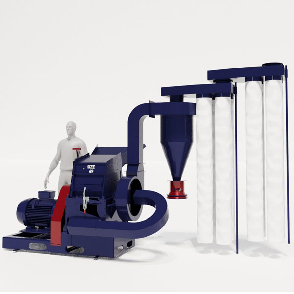 The Hippo #69 is fitted with an large integrated cast iron material handling fan – which pulls milled material from the milling chamber, and the product is then pushed to a cyclone, fitted with an 8 sock dust bank – for practically dust free milling.