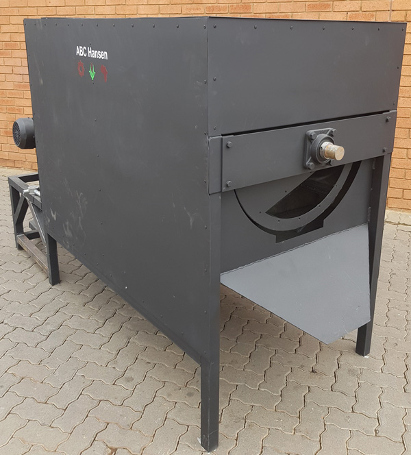 After the curing of the peanuts, they are transferred to a peanut deskinner – based off of our Turbosifter, which is also fitted with an aspirator, where the red skins are rubbed off of the peanuts, using bristled brushes in the sifter, and the remaining skins are sucked off with the aspirator, and discharged from a dust controlled cyclone.