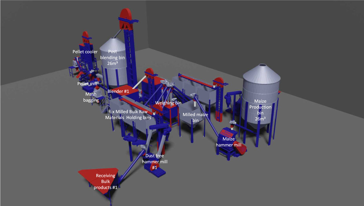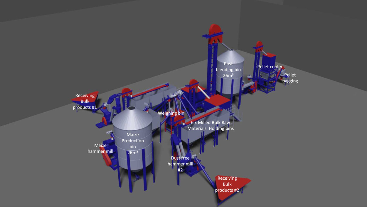 ABC Hansen Africa has developed as part of our feed milling equipment line, a complete line for the production of high energy feed, usually utilised in the production of poultry (both meat and egg production type feeds) and pig feeds (for either complete dry feeds, or additive feeds in liquid feeding systems), with a simple yet effective design, for mid range capacity feed mill operations with a capacity of 6TPH.