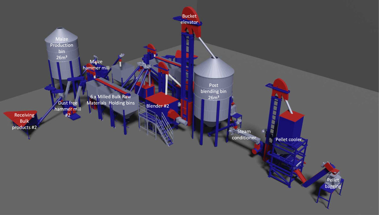 The system is a completely automated batching process, controlled by our in-house designed Compri-Batch batch controller, which is based on the widely used Unitronics Vision Series controller. By having the entire batching process automated, users will be able to produce reliable, repeatable results on their feed mixtures – taking out the risk for human error. The only responsibility for labour in the system would be in the raw material silo filling function and during packaging.