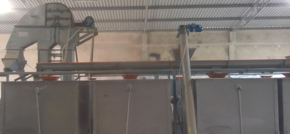 The mash feed is then pelleted using ring-die type pellet mills, which discharge into a single bucket elevator, which then ejects the material to a counterflow pellet cooler, where the pellets are cooled down rapidly using ambient air – driven by a centrifugal fan – to prevent breakage of the pellets and condensation on the pellets
