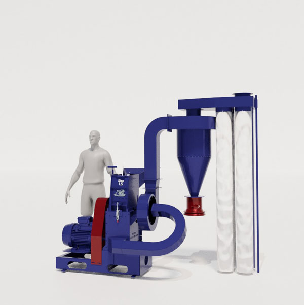The Hippo #1½ is fitted with an integrated cast iron material handling fan – which pulls milled material from the milling chamber, and the product is then pushed to a cyclone, fitted with a 4 sock dust bank – for almost dust free milling.