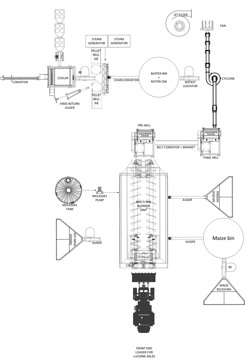 Using the proven MultiMix double spiral feed blenders from our sister company Cormall in Denmark, we are able to produce a full feed with the best homogeneity in the mixes available in the market today. The MultiMix blender received full bales of roughage (lucerne/grass/straw) and cuts them into digestible pieces.