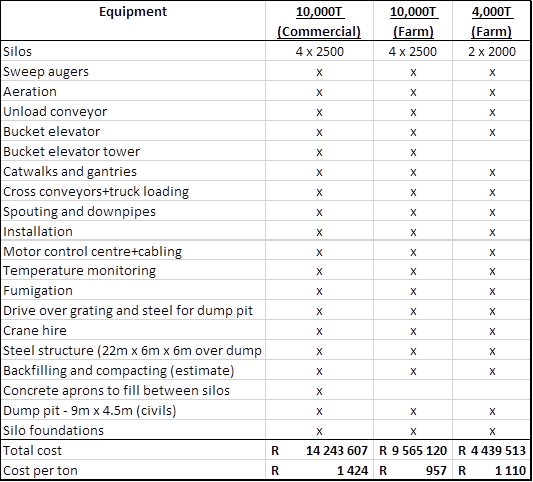 Add approximately R380,000 for cleaner with bucket elevator, 60 ton per hour.