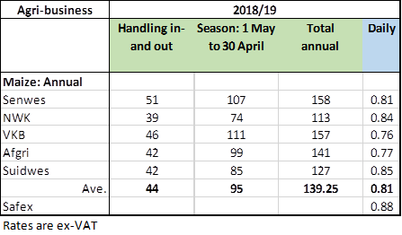 The table below outlines the storage cost for the five main agri-businesses. Today, this is a highly competitive business with each agri-business determining its own rate. What makes comparisons difficult is that agri-businesses offer several different packages in terms of which they either load grain on the farm or pay for the farmer to deliver the grain to a specific silo. This is mostly related to under-utilized silos or when they try to expand their business into neighbouring territories.